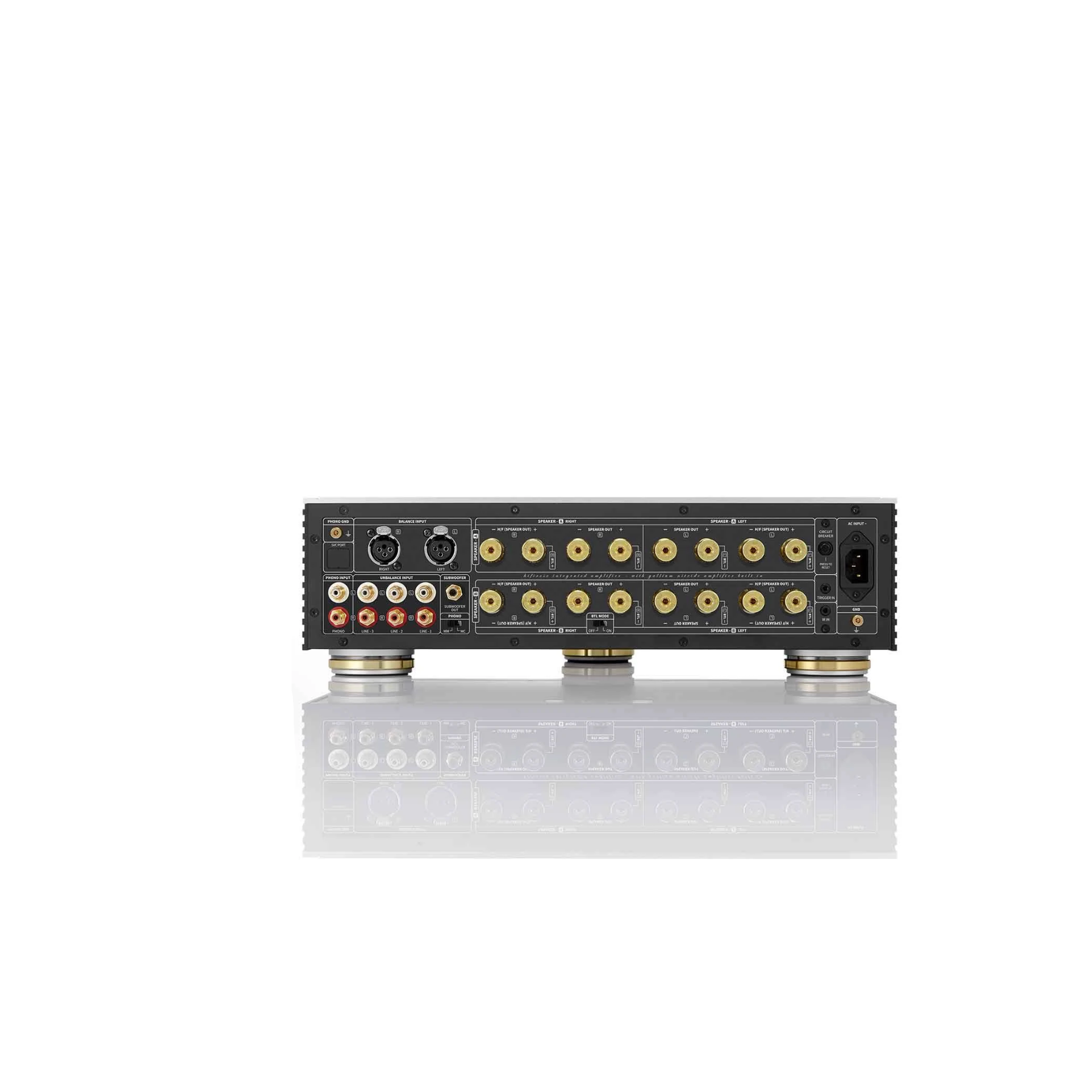 Each channel of the RA180 amplifier is equipped with an AMP module specialised for stable bass and balance and a module specialised for soft treble and super tweeter area, with two modules. Each AMP module supports 200W (8 Ohms) and can output up to 400W per channel, for a total output of 800 watts. There are two independent modules that divide the high and low frequencies respectively, so that the speaker and, when connected, Bi-Amping has a driving force which is increased without being affected by the back electromotive force. RA180 also features BTL Mode which combines the output of two independent modules to produce a thicker and more balanced sound.