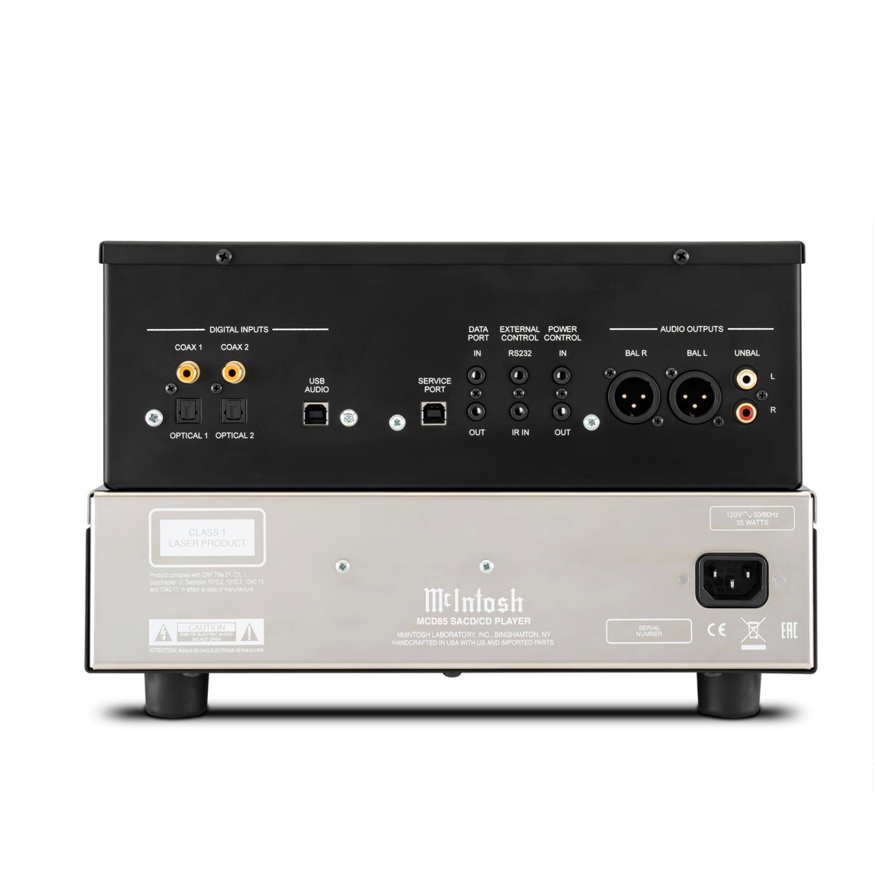 The MCD85’s disc transport uses 2x read speed and a robust die-cast aluminum tray with a new beveled front edge that matches the chassis styling. A twin-laser optical pickup, optimized separately for SACD and CD wavelengths, ensures accurate data reading, superior error correction, and quiet, smooth operation. Integration with McIntosh systems is effortless via Power Control and data ports.